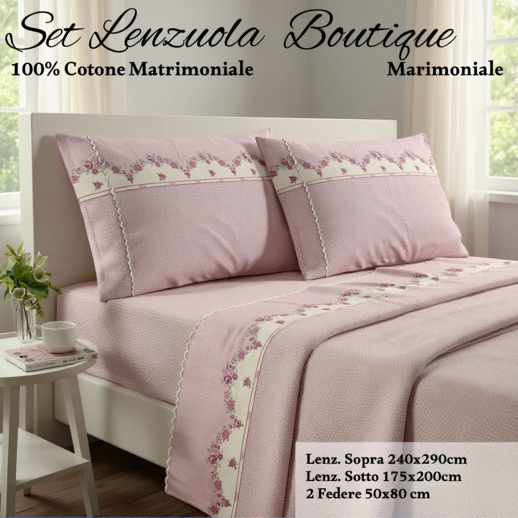 Il completo Boutique è impreziosito da un elegante orlo smerlato, che crea un effetto di grande finezza.