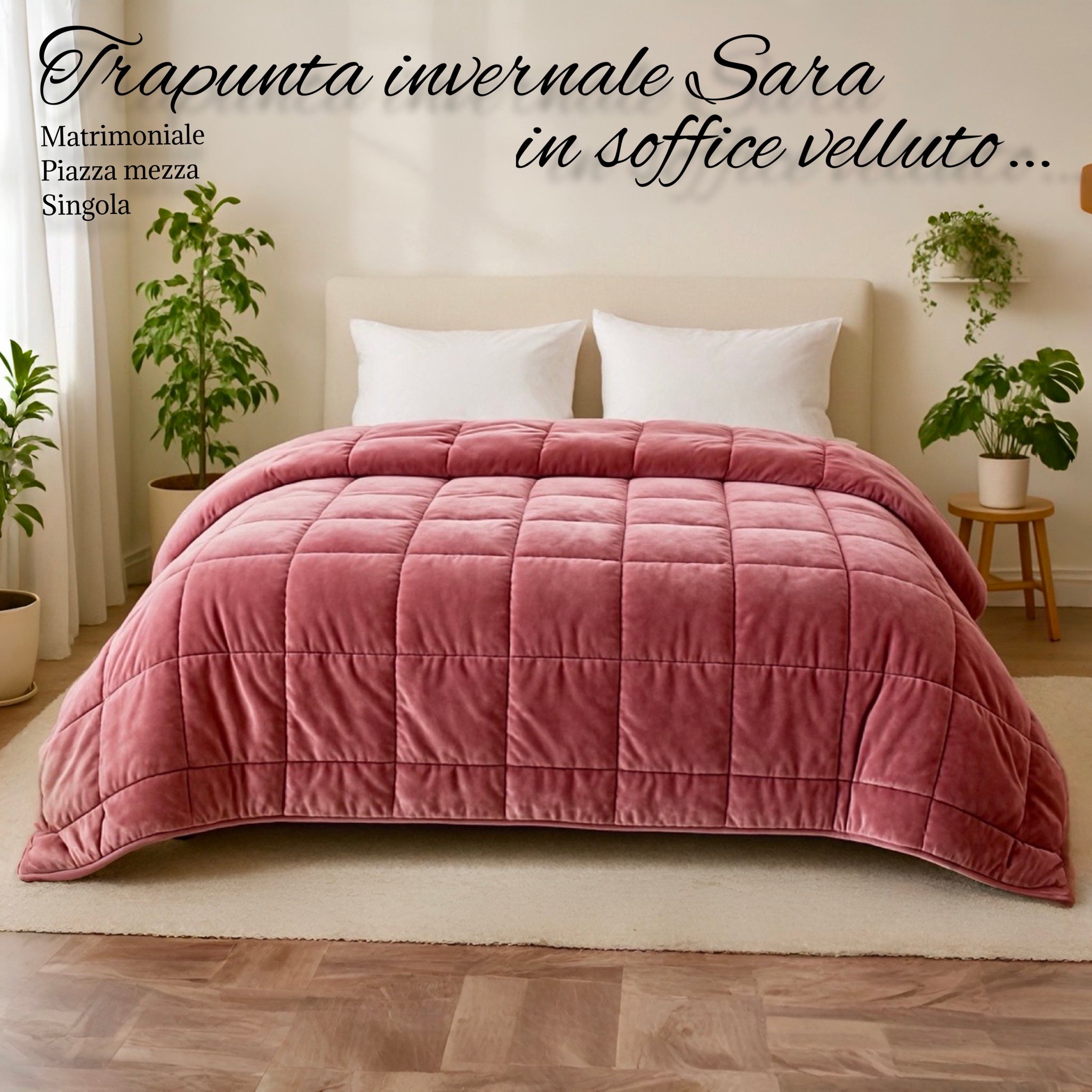 Avvolgiti nel calore della Trapunta Invernale Sara, realizzata con imbottitura da 380 gr/m² che assicura un comfort ideale durante le notti più fredde. Il morbido tessuto effetto velluto regala una sensazione soffice e raffinata, aggiungendo un tocco di eleganza alla tua camera da letto.