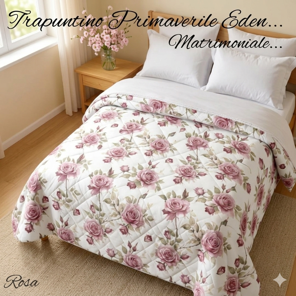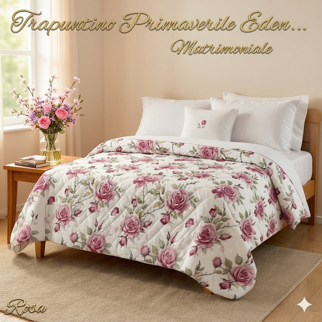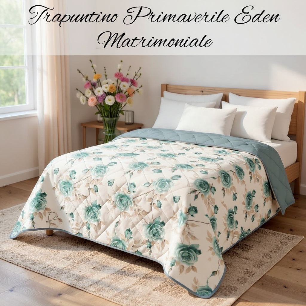 Il trapuntino primaverile Eden è pensato per offrire comfort e stile durante la primavera e l’estate. La sua elegante stampa floreale dona freschezza e luminosità alla camera da letto, rendendolo non solo funzionale ma anche decorativo.